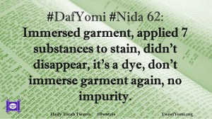 DafYomi, Nida #DafYomi #Nida 62 Date: December 24, 2019Author: ysspitz #DafYomi #Nida 62: Immersed garment, applied 7 substances to stain, didn’t disappear, it’s a dye, don’t immerse garment again, no impurity. Share this: Share on X (Opens in new window) X Share on Facebook (Opens in new window) Facebook Like Loading... Related
