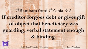 #RambamYomi #Zehia 3:2 If creditor forgoes debt or gives gift of object that beneficiary was guarding, verbal statement enough & binding.
