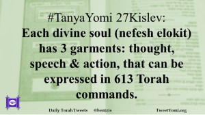 #TanyaYomi 27Kislev: Each divine soul (nefesh elokit) has 3 garments: thought, speech & action, that can be expressed in 613 Torah commands.