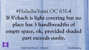 #HalachaYomi OC 631:4 If S’chach is light covering but no place has 3 handbreadths of empty space, ok, provided shaded part exceeds sunlit.