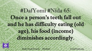 DafYomi, Nida #DafYomi #Nida 65 Date: December 29, 2019Author: ysspitz #DafYomi #Nida 65: Once a person’s teeth fall out and he has difficulty eating (old age), his food (income) diminishes accordingly. Share this: Share on X (Opens in new window) X Share on Facebook (Opens in new window) Facebook Like Loading... Related