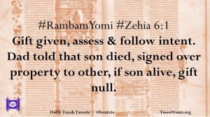 #RambamYomi #Zehia 6:1 Gift given, assess & follow intent. Dad told that son died, signed over property to other, if son alive, gift null.