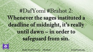 Brahot, DafYomi #DafYomi #Brahot 2 Date: January 7, 2020Author: ysspitz #DafYomi #Brahot 2: Whenever the sages instituted a deadline of midnight, it’s really until dawn – in order to safeguard from sin. Share this: Share on X (Opens in new window) X Share on Facebook (Opens in new window) Facebook Like Loading... Related