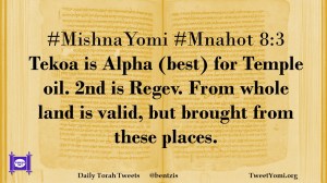 #MishnaYomi #Mnahot 8:3 Tekoa is Alpha (best) for Temple oil. 2nd is Regev. From whole land is valid, but brought from these places.
