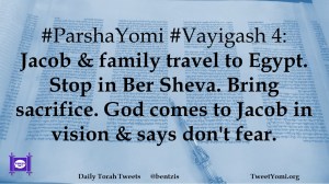 #ParshaYomi #Vayigash 4: Jacob & family travel to Egypt. Stop in Ber Sheva. Bring sacrifice. God comes to Jacob in vision & says don’t fear.