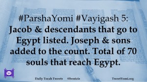 #ParshaYomi #Vayigash 5: Jacob & descendants that go to Egypt listed. Joseph & sons added to the count. Total of 70 souls that reach Egypt.