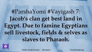 #ParshaYomi #Vayigash 7: Jacob’s clan get best land in Egypt. Due to famine Egyptians sell livestock, fields & selves as slaves to Pharaoh.