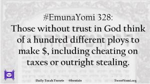 #EmunaYomi 328: Those without trust in God think of a hundred different ploys to make $, including cheating on taxes or outright stealing.