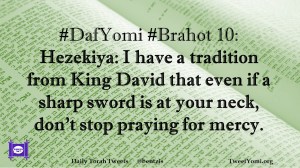 Brahot, DafYomi #DafYomi #Brahot 10 Date: January 13, 2020Author: ysspitz #DafYomi #Brahot 10: Hezekiya: I have a tradition from King David that even if a sharp sword is at your neck, don’t stop praying for mercy. Share this: Share on X (Opens in new window) X Share on Facebook (Opens in new window) Facebook Like Loading... Related