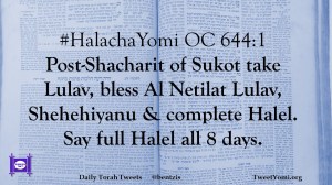 #HalachaYomi OC 644:1 Post-Shacharit of Sukot take Lulav, bless Al Netilat Lulav, Shehehiyanu & complete Halel. Say full Halel all 8 days.