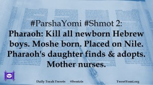 #ParshaYomi #Shmot 2: Pharaoh: Kill all newborn Hebrew boys. Moshe born. Placed on Nile. Pharaoh’s daughter finds & adopts. Mother nurses.