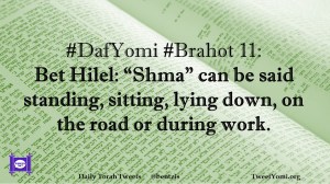 Brahot, DafYomi #DafYomi #Brahot 11 Date: January 14, 2020Author: ysspitz #DafYomi #Brahot 11: Bet Hilel: “Shma” can be said standing, sitting, lying down, on the road or during work. Share this: Share on X (Opens in new window) X Share on Facebook (Opens in new window) Facebook Like Loading... Related