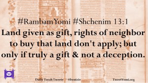#RambamYomi #Shchenim 13:1 Land given as gift, rights of neighbor to buy that land don’t apply; but only if truly a gift & not a deception.