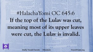 HalachaYomi #HalachaYomi OC 645:6 Date: January 16, 2020Author: ysspitz #HalachaYomi OC 645:6 If the top of the Lulav was cut, meaning most of its upper leaves were cut, the Lulav is invalid. Share this: Share on X (Opens in new window) X Share on Facebook (Opens in new window) Facebook Like Loading... Related