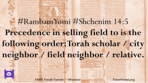 #RambamYomi #Shchenim 14:5 Precedence in selling field to is the following order: Torah scholar / city neighbor / field neighbor / relative.