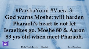 #ParshaYomi #Vaera 3: God warns Moshe: will harden Pharaoh’s heart & not let Israelites go. Moshe 80 & Aaron 83 yrs old when meet Pharaoh.