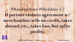 #RambamYomi #Sheluhim 5:2 If partner violates agreement w/ merchandise: sells on credit, takes abroad, etc., takes loss, but splits profits.
