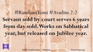 #RambamYomi #Avadim 2:2 Servant sold by court serves 6 years from day sold. Works on Sabbatical year, but released on Jubilee year.