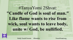 #TanyaYomi 2Shvat: “Candle of God is soul of man.” Like flame wants to rise from wick, soul wants to leave body, unite w/ God, be nullified.