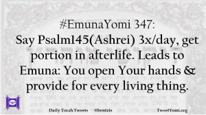 #EmunaYomi 347: Say Psalm145(Ashrei) 3x/day, get portion in afterlife. Leads to Emuna: You open Your hands & provide for every living thing.