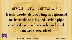 #MishnaYomi #Hulin 3:3 Birds Trefa if: esophagus, gizzard or intestines pierced; windpipe severed; weasel struck on head; innards scorched.