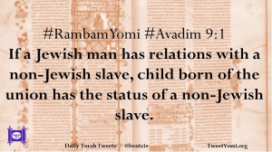 #RambamYomi #Avadim 9:1 If a Jewish man has relations with a non-Jewish slave, child born of the union has the status of a non-Jewish slave.