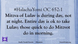 #HalachaYomi OC 652:1 Mitzva of Lulav is during day, not at night. Entire day is ok to take Lulav; those quick to do Mitzvot do in morning.