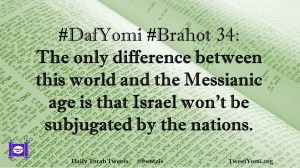 Brahot, DafYomi #DafYomi #Brahot 34 Date: February 6, 2020Author: ysspitz #DafYomi #Brahot 34: The only difference between this world and the Messianic age is that Israel won’t be subjugated by the nations. Share this: Share on X (Opens in new window) X Share on Facebook (Opens in new window) Facebook Like Loading... Related