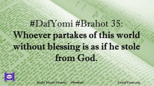 Brahot, DafYomi #DafYomi #Brahot 35 Date: February 7, 2020Author: ysspitz #DafYomi #Brahot 35: Whoever partakes of this world without blessing is as if he stole from God. Share this: Share on X (Opens in new window) X Share on Facebook (Opens in new window) Facebook Like Loading... Related