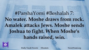 #ParshaYomi #Beshalah 7: No water. Moshe draws from rock. Amalek attacks Jews. Moshe sends Joshua to fight. When Moshe’s hands raised, win.