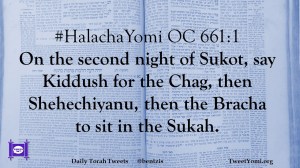 #HalachaYomi OC 661:1 On the second night of Sukot, say Kiddush for the Chag, then Shehechiyanu, then the Bracha to sit in the Sukah.