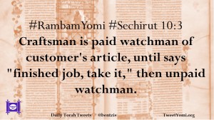#RambamYomi #Sechirut 10:3 Craftsman is paid watchman of customer’s article, until says “finished job, take it,” then unpaid watchman.