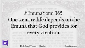 EmunaYomi #EmunaYomi 365 Date: February 17, 2020Author: ysspitz #EmunaYomi 365: One’s entire life depends on the Emuna that God provides for every creation. Share this: Share on X (Opens in new window) X Share on Facebook (Opens in new window) Facebook Like Loading... Related