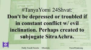 #TanyaYomi 24Shvat: Don’t be depressed or troubled if in constant conflict w/ evil inclination. Perhaps created to subjugate SitraAchra.