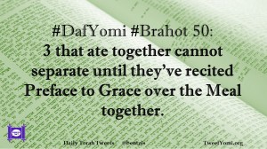 Brahot, DafYomi #DafYomi #Brahot 50 Date: February 22, 2020Author: ysspitz #DafYomi #Brahot 50: 3 that ate together cannot separate until they’ve recited Preface to Grace over the Meal together. Share this: Share on X (Opens in new window) X Share on Facebook (Opens in new window) Facebook Like Loading... Related