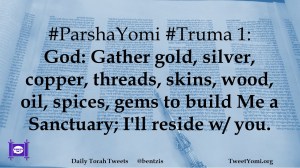 #ParshaYomi #Truma 1: God: Gather gold, silver, copper, threads, skins, wood, oil, spices, gems to build Me a Sanctuary; I’ll reside w/ you.