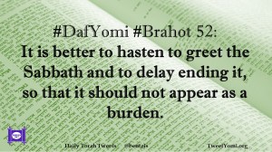 Brahot, DafYomi #DafYomi #Brahot 52 Date: February 24, 2020Author: ysspitz #DafYomi #Brahot 52: It is better to hasten to greet the Sabbath and to delay ending it, so that it should not appear as a burden. Share this: Share on X (Opens in new window) X Share on Facebook (Opens in new window) Facebook Like Loading... Related