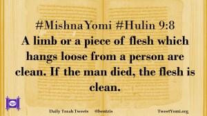 #MishnaYomi #Hulin 9:8 A limb or a piece of flesh which hangs loose from a person are clean. If the man died, the flesh is clean.