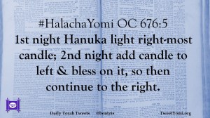 #HalachaYomi OC 676:5 1st night Hanuka light right-most candle; 2nd night add candle to left & bless on it, so then continue to the right.