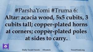 #ParshaYomi #Truma 6: Altar: acacia wood, 5×5 cubits, 3 cubits tall; copper-plated horns at corners; copper-plated poles at sides to carry.