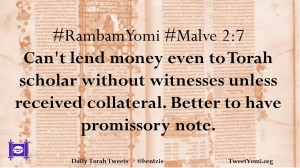 #RambamYomi #Malve 2:7 Can’t lend money even to Torah scholar without witnesses unless received collateral. Better to have promissory note.
