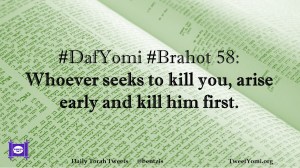 Brahot, DafYomi #DafYomi #Brahot 58 Date: March 1, 2020Author: ysspitz #DafYomi #Brahot 58: Whoever seeks to kill you, arise early and kill him first. Share this: Share on X (Opens in new window) X Share on Facebook (Opens in new window) Facebook Like Loading... Related