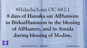 #HalachaYomi OC 682:1 8 days of Hanuka say AlHanisim in BirkatHamazon in the blessing of AlHaaretz, and in Amida during blessing of Modim.
