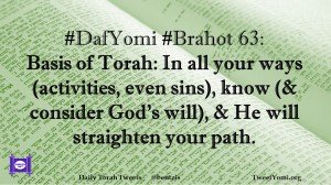 Brahot, DafYomi #DafYomi #Brahot 63 Date: March 6, 2020Author: ysspitz #DafYomi #Brahot 63: Basis of Torah: In all your ways (activities, even sins), know (& consider God’s will), & He will straighten your path. Share this: Share on X (Opens in new window) X Share on Facebook (Opens in new window) Facebook Like Loading... Related