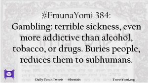 #EmunaYomi 384: Gambling: terrible sickness, even more addictive than alcohol, tobacco, or drugs. Buries people, reduces them to subhumans.