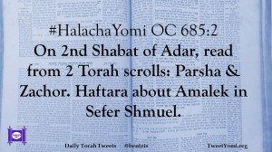 #HalachaYomi OC 685:2 On 2nd Shabat of Adar, read from 2 Torah scrolls: Parsha & Zachor. Haftara about Amalek in Sefer Shmuel.