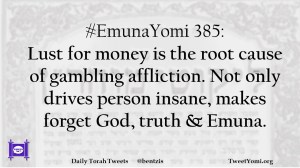 #EmunaYomi 385: Lust for money is the root cause of gambling affliction. Not only drives person insane, makes forget God, truth & Emuna.
