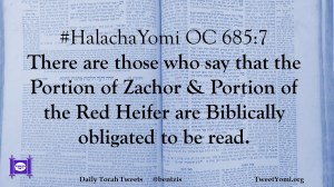 #HalachaYomi OC 685:7 There are those who say that the Portion of Zachor & Portion of the Red Heifer are Biblically obligated to be read.