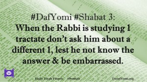 DafYomi, Shabat #DafYomi #Shabat 3 Date: March 10, 2020Author: ysspitz #DafYomi #Shabat 3: When the Rabbi is studying 1 tractate don’t ask him about a different 1, lest he not know the answer & be embarrassed. Share this: Share on X (Opens in new window) X Share on Facebook (Opens in new window) Facebook Like Loading... Related