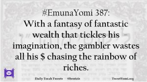 #EmunaYomi 387: With a fantasy of fantastic wealth that tickles his imagination, the gambler wastes all his $ chasing the rainbow of riches.